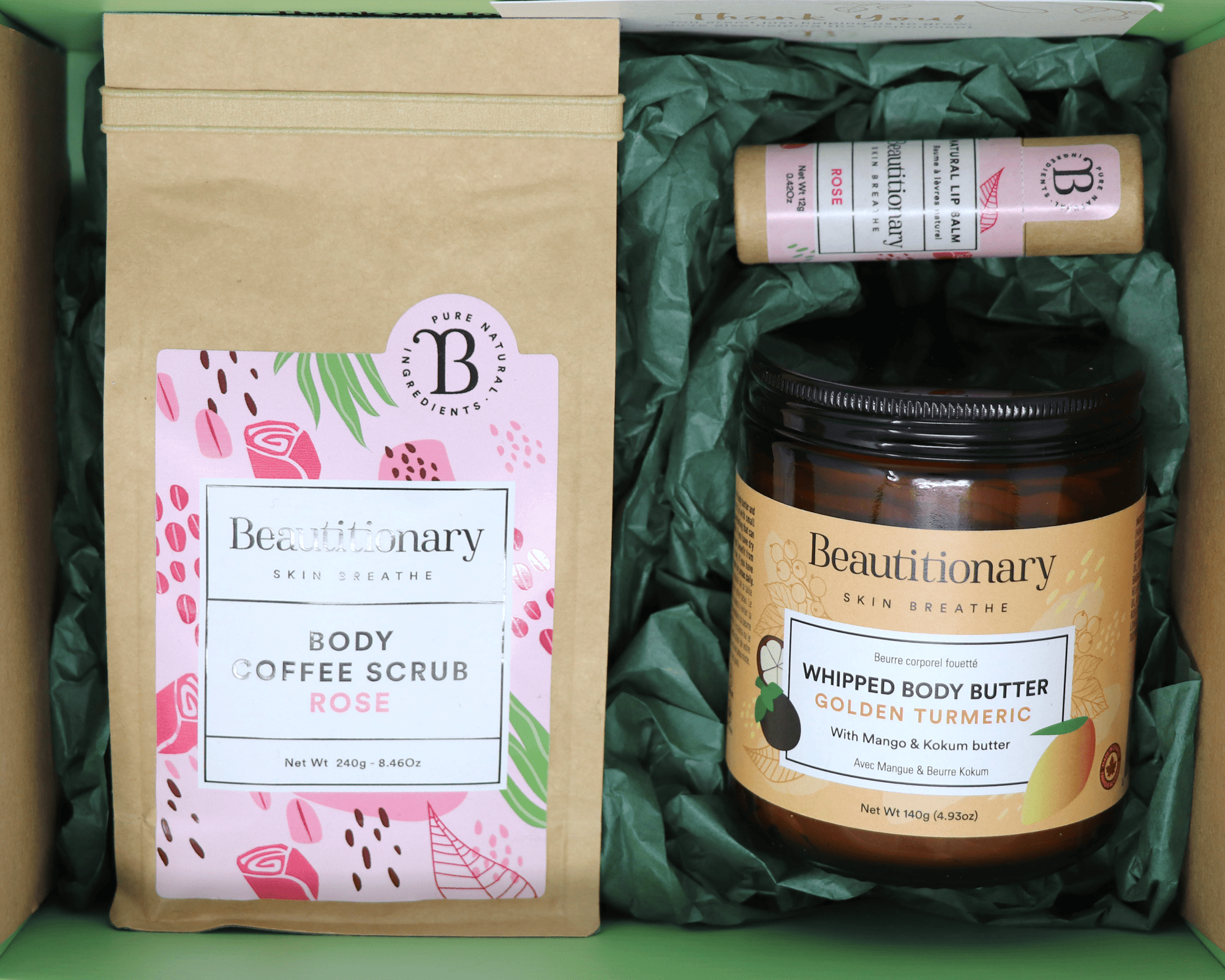 Reveal smooth, hydrated, naturally glowing skin from head to toe. Our Body Care Set brings together three everyday essentials: a Vegan Coffee Scrub, a Whipped Body Butter, and a Natural Vegan Lip Balm. Crafted to exfoliate, nourish, and protect—all with gentle, plant-based ingredients suitable for every skin type.